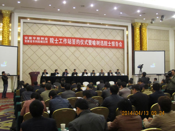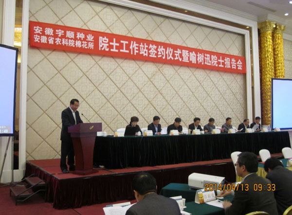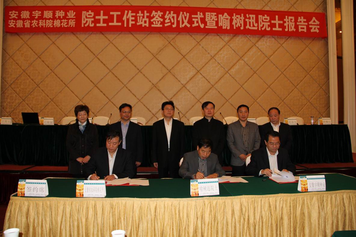 2014年4月13日上午,由中國(guó)工程院喻樹(shù)迅院士與安徽宇順?lè)N業(yè)開(kāi)發(fā)有限公司、安徽省農(nóng)科院棉花所共建成立的“棉花院士工作站”簽約儀式在安慶碧桂園鳳凰酒店舉行,標(biāo)志著全市首家農(nóng)業(yè)院士工作站簽約成立。中國(guó)農(nóng)科院棉花所研究員、中國(guó)工程院院士喻樹(shù)迅,安徽省農(nóng)科院院長(zhǎng)楊劍波以及省農(nóng)業(yè)機(jī)械推廣總站、省農(nóng)科院棉花所、國(guó)家棉花長(zhǎng)江試驗(yàn)站等部門(mén)的領(lǐng)導(dǎo)專家出席簽約儀式。市農(nóng)委、市科技局、市財(cái)政局,有關(guān)縣區(qū)農(nóng)委(農(nóng)業(yè)局)負(fù)責(zé)人和相關(guān)技術(shù)人員參加簽約儀式。簽約儀式由市政府副秘書(shū)長(zhǎng)張仕慶主持。市政府副市長(zhǎng)張小青在儀式上指出,安慶農(nóng)業(yè)基礎(chǔ)較好,是國(guó)家農(nóng)業(yè)部確定的棉花優(yōu)質(zhì)生產(chǎn)區(qū)域,現(xiàn)已發(fā)展為全國(guó)棉花紡織精品生產(chǎn)基地,我市的望江縣和宿松縣是全國(guó)著名的棉花百?gòu)?qiáng)縣。他強(qiáng)調(diào),院士工作站的成立契合我市農(nóng)業(yè)領(lǐng)域正在實(shí)施的“5211”工程,必將進(jìn)一步提升我市棉花生產(chǎn)儲(chǔ)運(yùn)能力和科技科研水平,為實(shí)現(xiàn)我市乃至我省棉花生產(chǎn)方式的根本變革提供技術(shù)支撐,也必將推進(jìn)我市農(nóng)業(yè)產(chǎn)業(yè)化整體水平。