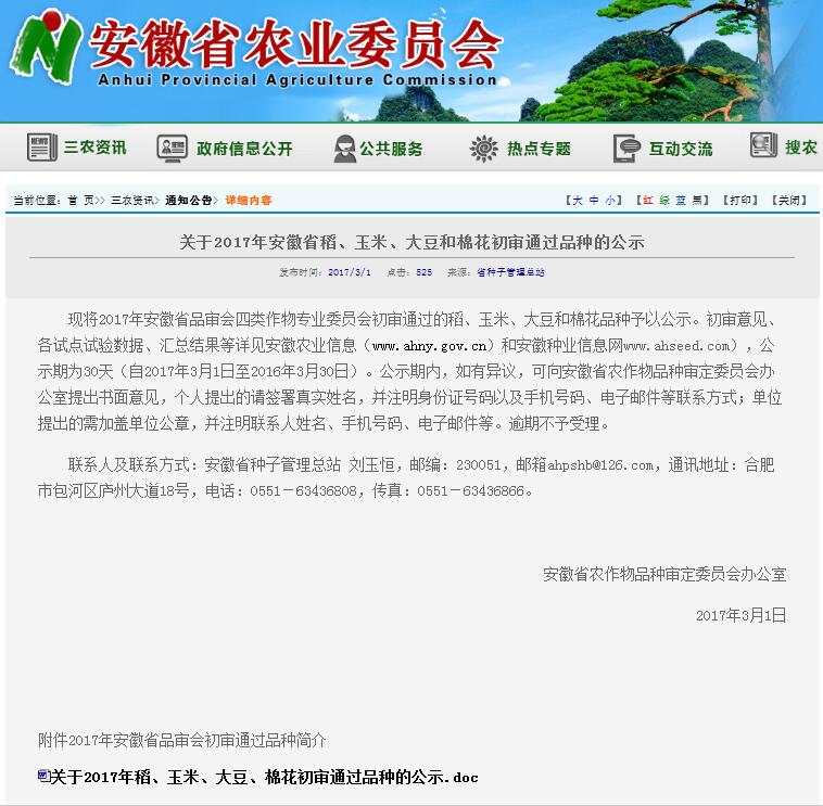 2017年3月1日,安徽省農(nóng)業(yè)委員會下發(fā)了《關于2017年安徽省稻、玉米、大豆和棉花初審通過品種的公示》,文件對2017年安徽省品審會四類作物專業(yè)委員會初審通過的稻、玉米、大豆和棉花予以公示。