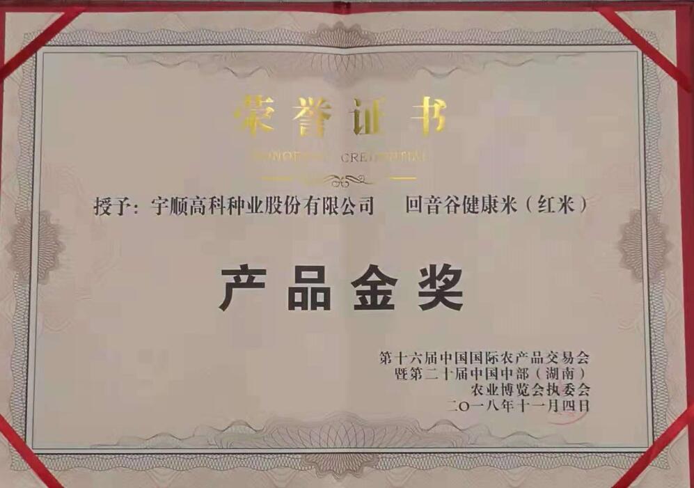 我司自主研發(fā)生產(chǎn)的“回音谷健康米(紅米)”繼中國安徽名優(yōu)農(nóng)產(chǎn)品暨農(nóng)業(yè)產(chǎn)業(yè)化交易會(huì)榮獲參展產(chǎn)品金獎(jiǎng)之后,2018年11月4日,再次榮獲“第十六屆中國國際農(nóng)產(chǎn)品交易會(huì)暨第二十屆中國中部(湖南)農(nóng)業(yè)博覽會(huì)”產(chǎn)品金獎(jiǎng)。