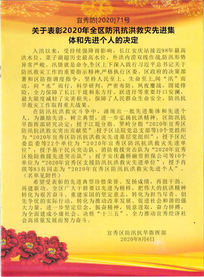 2020年8月8日,在安慶一中(龍山校區(qū))多媒體會議室召開了“2020年全區(qū)防汛抗洪救災(zāi)先進(jìn)基地和先進(jìn)個人”表彰大會,區(qū)委、區(qū)政府,各委辦局、各鎮(zhèn)街,受表彰先進(jìn)集體主要負(fù)責(zé)人、受表彰先進(jìn)個人參加會議。會上,與會人員觀看了防汛抗洪救災(zāi)紀(jì)錄片,區(qū)委書記婁雪松宣讀了表彰決定。